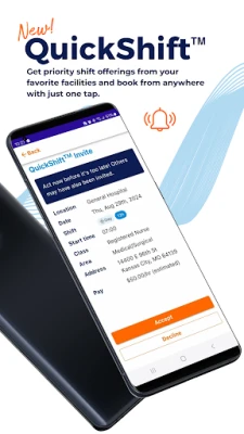 QuickShift enables the facilities you work at to invite their preferred employees to come back and pick up shifts directly through the app. After you work at a facility and they select you as a preferred employee, they can send you exclusive QuickShift invitations when new shifts become available. Accept or decline the shift in the app and be sure to enable notifications in your phone settings so you don’t miss a QuickShift invitation!